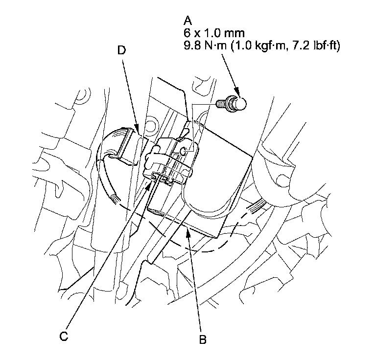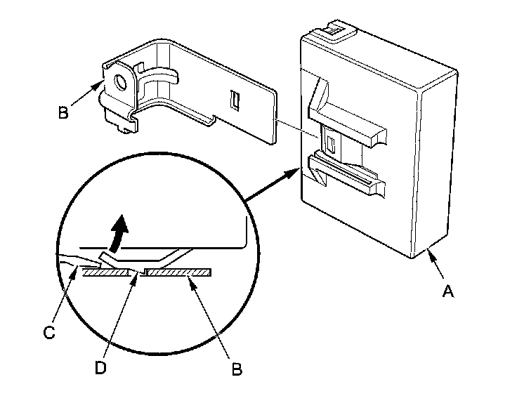 NOTE: To disconnect the TPMS control unit from its bracket, insert a small flat-tipped screwdriver (C) between the TPMS control unit and the bracket to release the hook (D), then slide out the TPMS control unit.