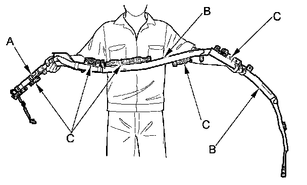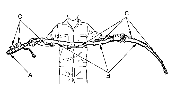 - The side curtain airbag module assembly is a long, jointed part containing an inflator (A), a flexible bag (B), and brackets (C). When removing or installing the side curtain airbag assembly, never do these things:
