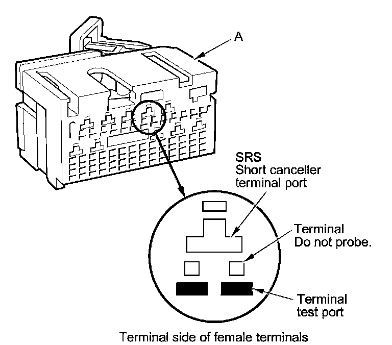 When diagnosing or troubleshooting at an SRS unit connector (A), use the terminal test port below the terminal you need to check. Gently insert the pin probes of the tester or jumper wire at the terminal test port from the terminal side.