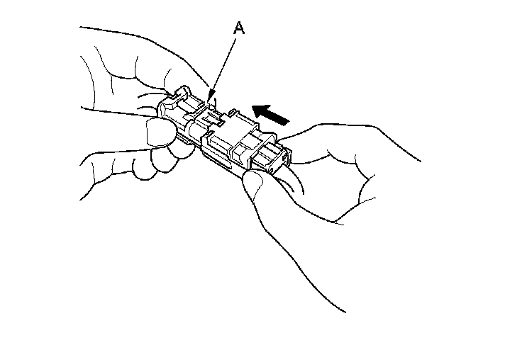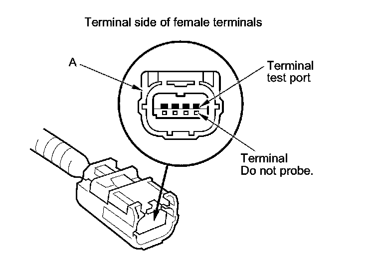 When diagnosis or troubleshooting is done at waterproof SRS connector (A), use the terminal test port above the terminal you need to check. Gently insert the pin probe of the tester or jumper wire at the terminal test port from the terminal side.