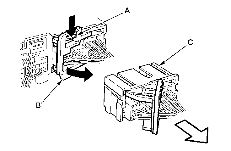 To release the lock, pull the lever (A) while pushing the lock (B), on the outside of the connector, then pull out the connector (C).