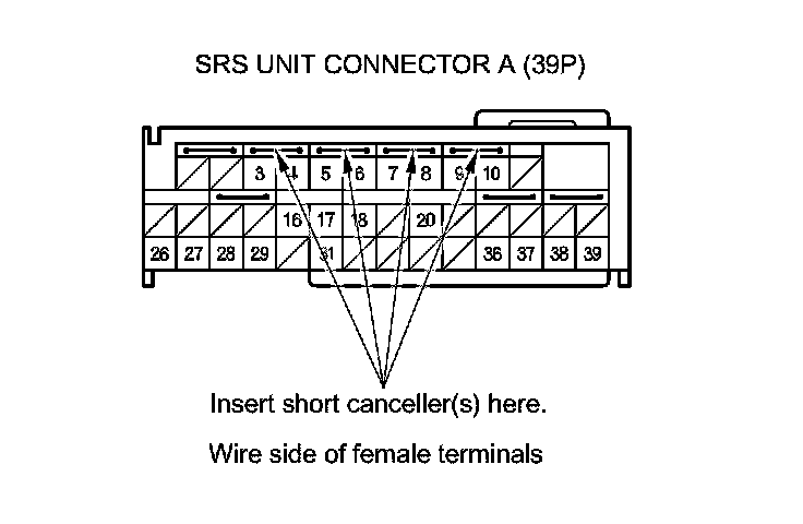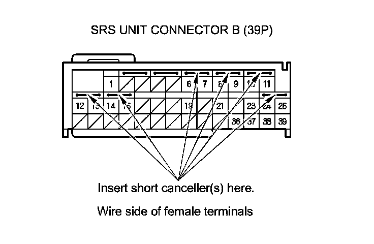 Terminal numbers are shown from the wire side of the female terminals. Insert the SRS short canceller(s) into the cavities on the terminal side of the connector.