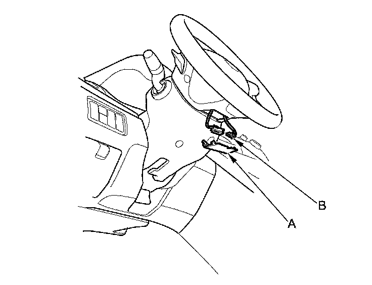 2. Remove the access panel (A) from the steering wheel, then disconnect the cable reel 4P connector (B) from the driver's airbag 4P connector.