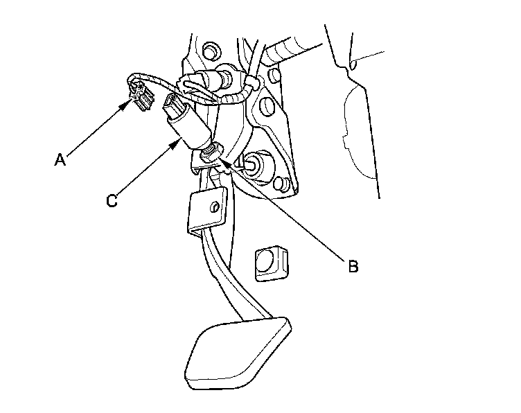 2. Loosen the locknut (B), then remove the clutch pedal position switch (C).