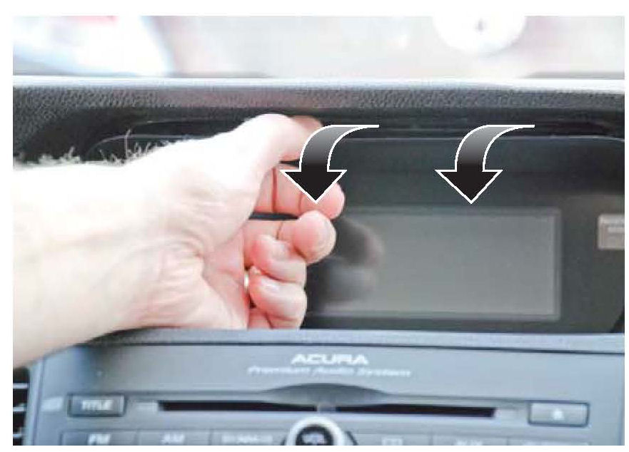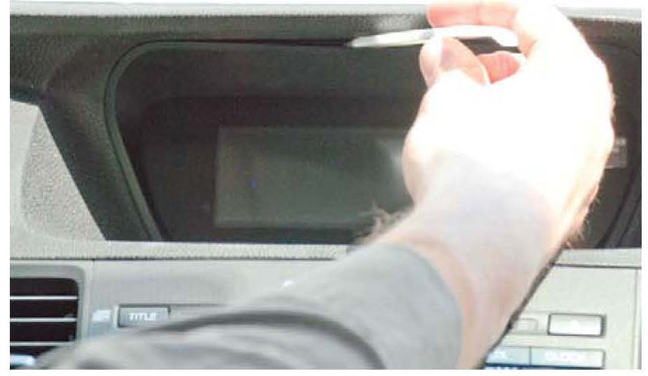 1. Using the trim tool, carefully pry on the top edge of the navigation display visor to detach its clips.