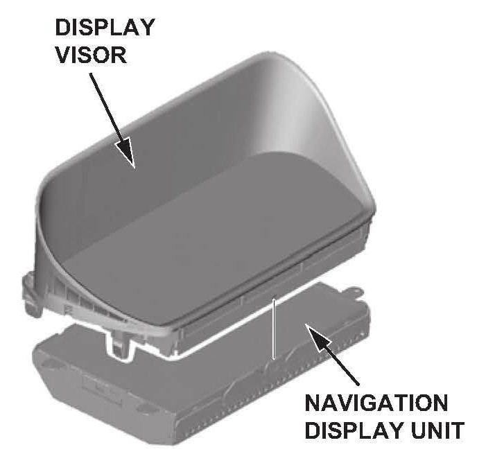 A properly installed navigation display assembly will not have a gap between the lower edge of the display visor and the dashboard. If a gap is present, remove the assembly and reinstall it to correct the misalignment.