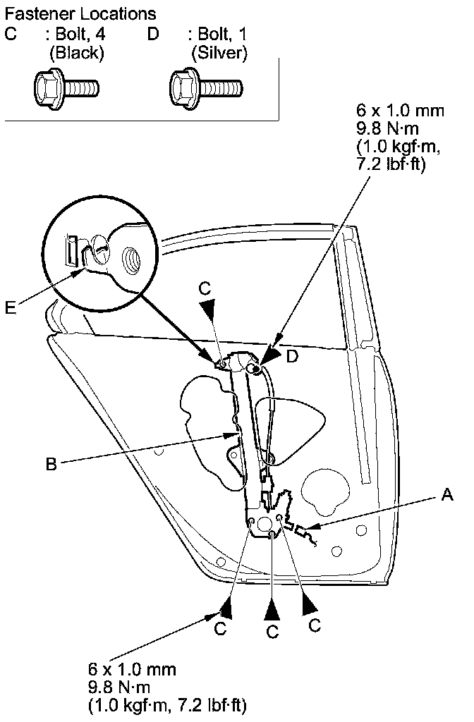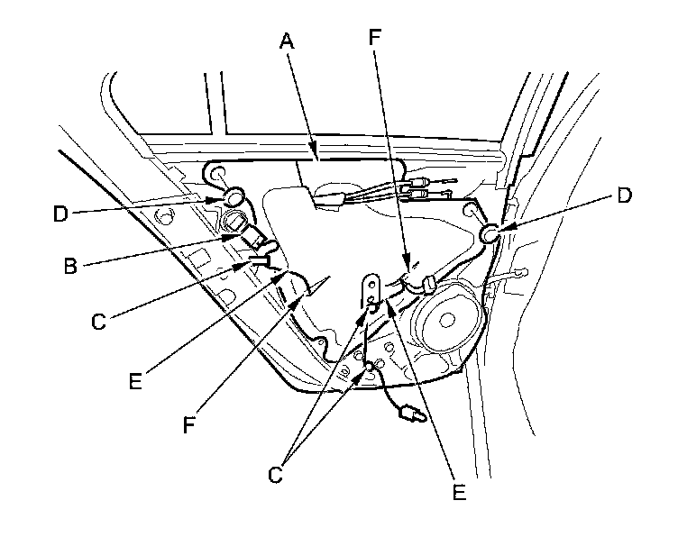 13. Remove the bolts (C), and loosen the bolt (D). Release the hook (E), then remove the regulator through the hole in the door.