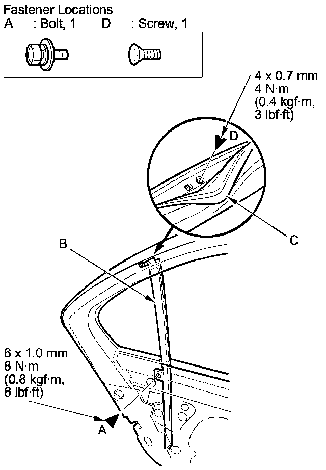 7. Remove the bolt (A) from the rear lower channel (B). Pull the door weatherstrip (C) away as needed, and remove the screw (D).