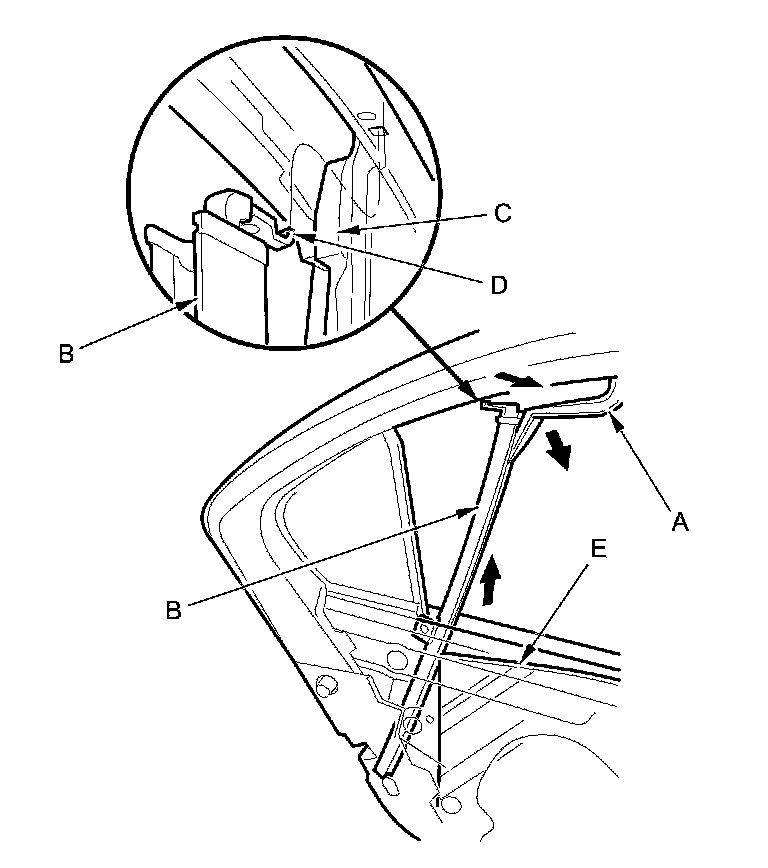 8. Pull the glass run channel (A) away as needed. Pull the rear lower channel (B) forward from the quarter glass seal (C), then release the upper hook (D) from the door. Remove the rear lower channel from the rear door glass (E), then pull the rear lower channel up to remove it.