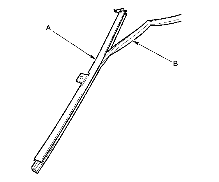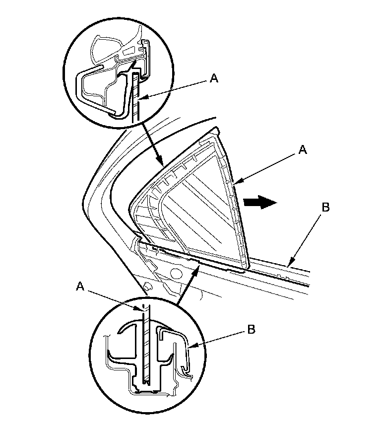 9. Remove the rear lower channel (A) from the glass run channel (B).