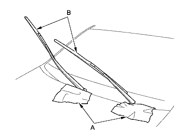 3. Raise the wiper arms (B) off the windshield, then remove the wiper arms.