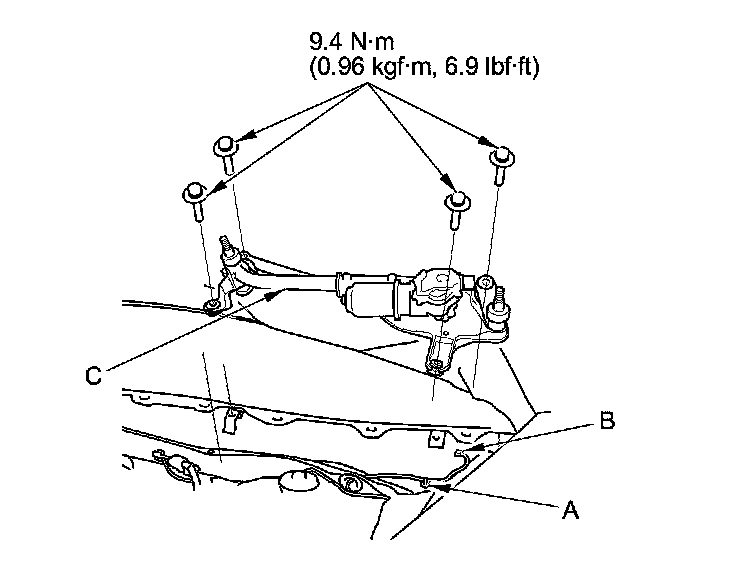 11. Install the wiper motor to the wiper linkage assembly in the reverse order of removal.