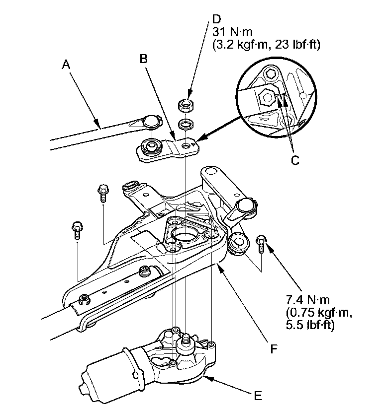 9. Remove the three bolts, and separate the wiper motor from the linkage (F).