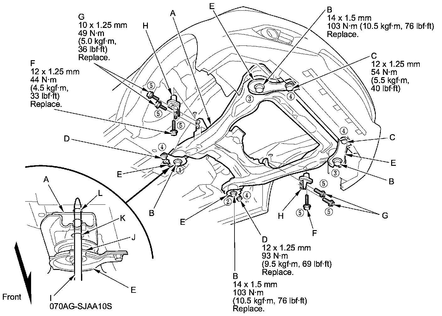 After removing the subframe mounting bolts, the front subframe middle rubber mount mounting bolts, the front subframe rear stiffener mounting bolts, the rear engine mounting base bracket mounting bolts, and the rear engine mounting upper base bracket mounting bolts, be sure to replace them with new ones.
