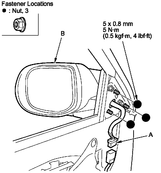 5. While holding the mirror (B), remove the nuts securing the mirror.