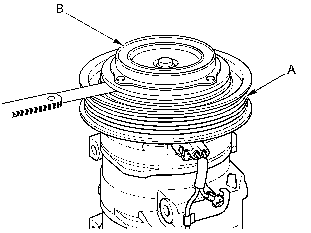 3. Measure the clearance between the rotor pulley (A) and the pressure plate (B) all the way around. If the clearance is not within specified limits, remove the pressure plate Service and Repair and add or remove shims as needed to increase or decrease clearance.