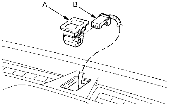 Using a flat-tip screwdriver wrapped with protective tape, pry up the sunlight sensor (A) from the dashboard, then disconnect the connector (B). Be careful not to damage the sensor and the dashboard.