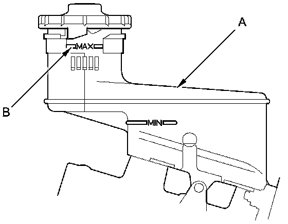 1. Make sure the brake fluid level in the reservoir (A) is at the MAX (upper) level line (B).