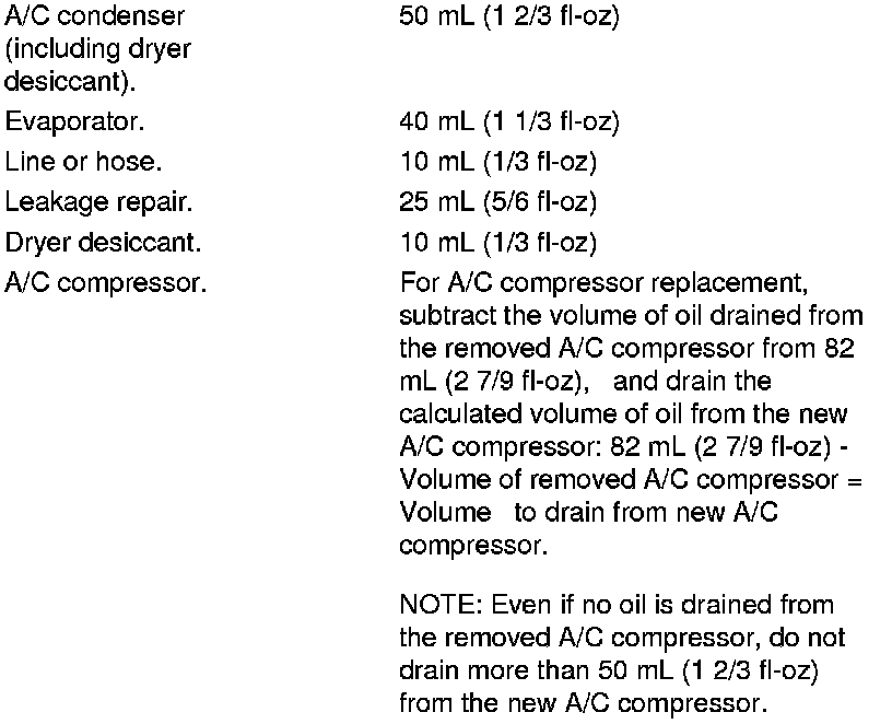 It is important to have the correct amount of refrigerant oil in the A/C system to ensure proper lubrication of the A/C compressor. Too little oil damages the compressor; too much oil reduces the cooling capacity of the system, and can produce high vent temperatures.