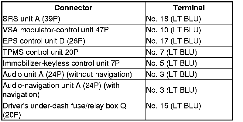 Repair short in the wire between the DLC No. 7(K-line) and the VSA modulator-control unit, the EPS control unit, the SRS unit, the TPMS control unit, the immobilizer-keyless control unit, the audio unit, or the driver's under-dash fuse/relay box.�