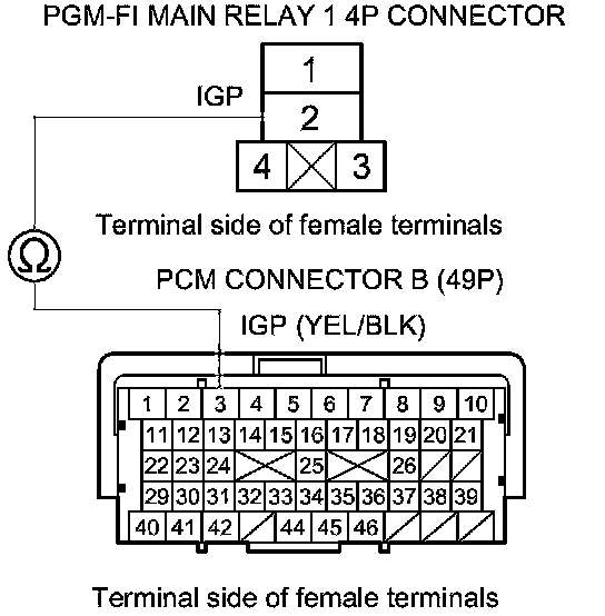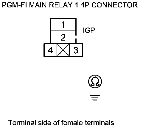 43. Check for continuity between PGM-FI main relay 1 4P connector terminal No. 2 and body ground.