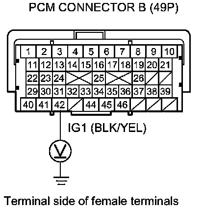 59. Measure the voltage between PCM connector terminal B42 and body ground.