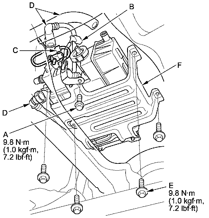 Remove the bolts (E), and move the EVAP canister assembly (F) to the rear.