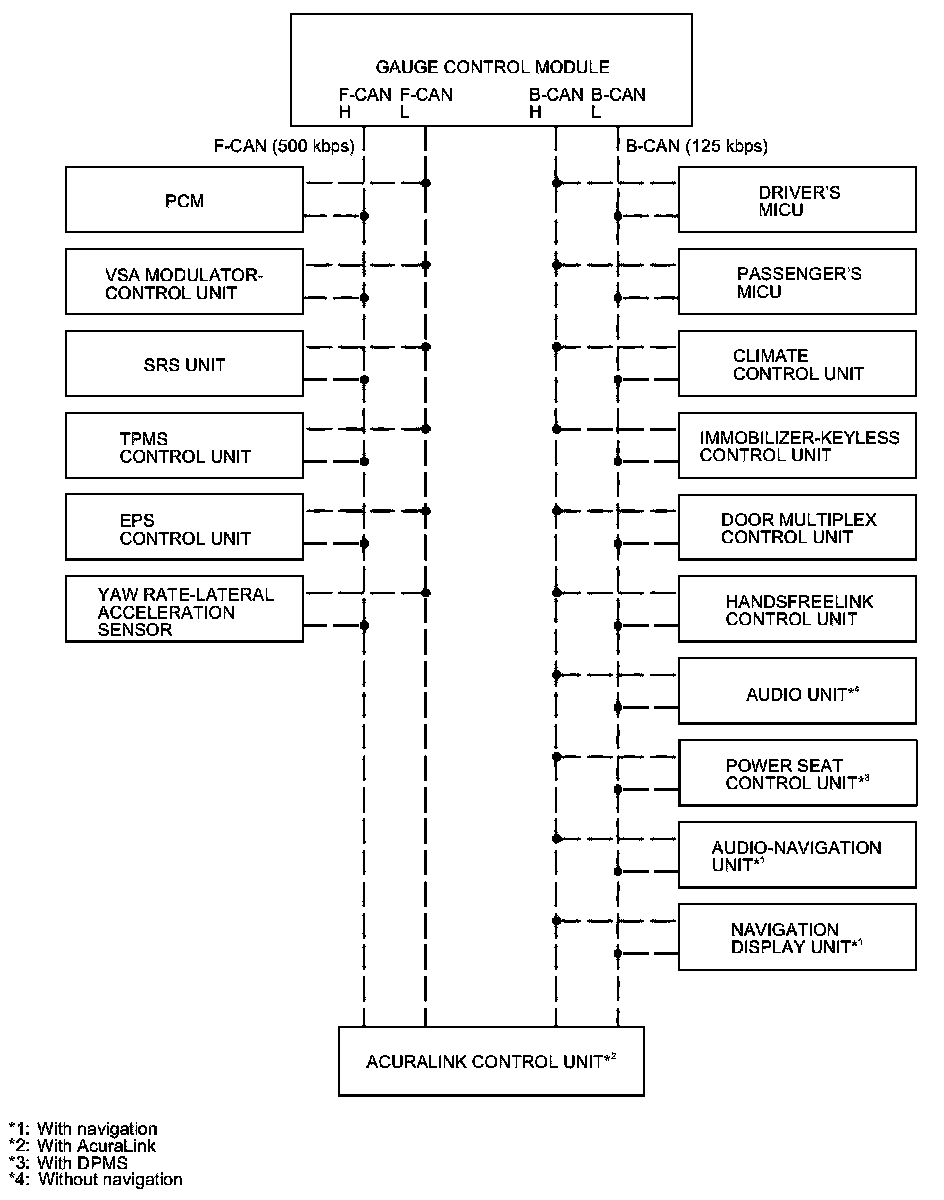 The gauge control module acts as a gateway to allow both systems to share information. The gauge control module translates and relays the information from B-CAN to F-CAN and from F-CAN to B-CAN.