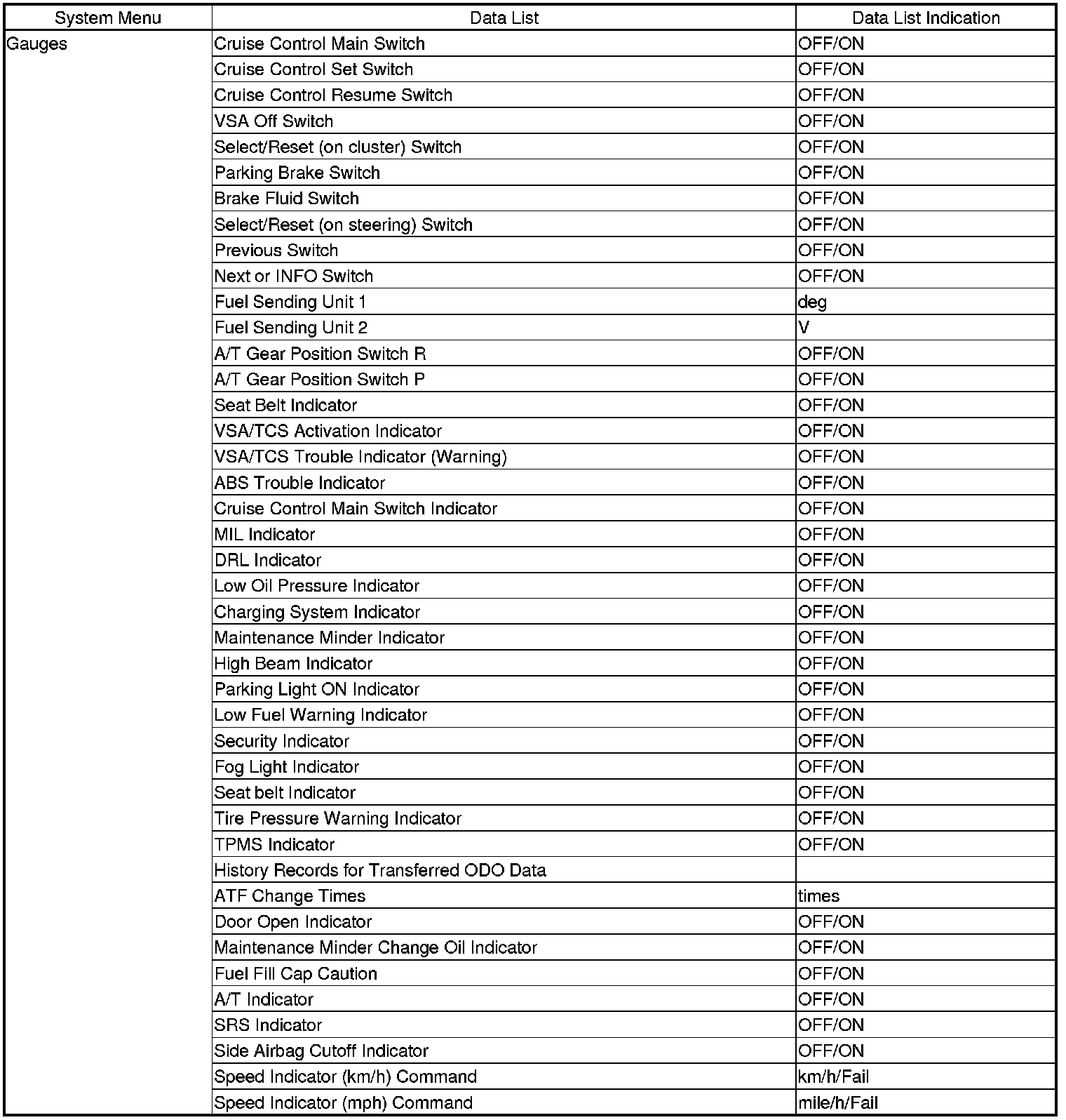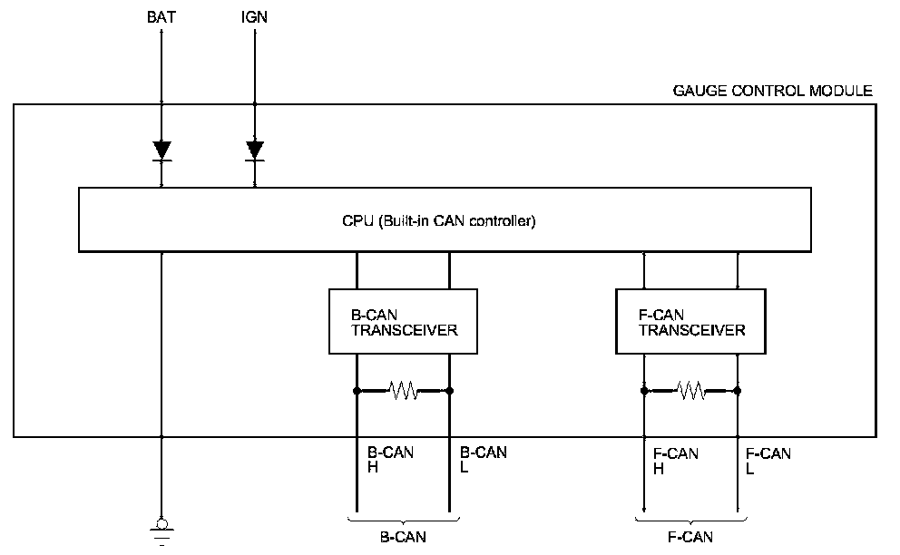 The body controller area network (B-CAN) and the fast controller area network (F-CAN) share information between multiple electronic control units (ECUs). B-CAN communication moves at a slower speed (125 kbps) for convenience related items and for other functions. F-CAN information moves at a faster speed (500 kbps) for "real time" functions such as fuel and emissions data. To allow both systems to share information, the gauge control module translates and relays the information from B-CAN to F-CAN and from F-CAN to B-CAN. This is called the Gateway Function.