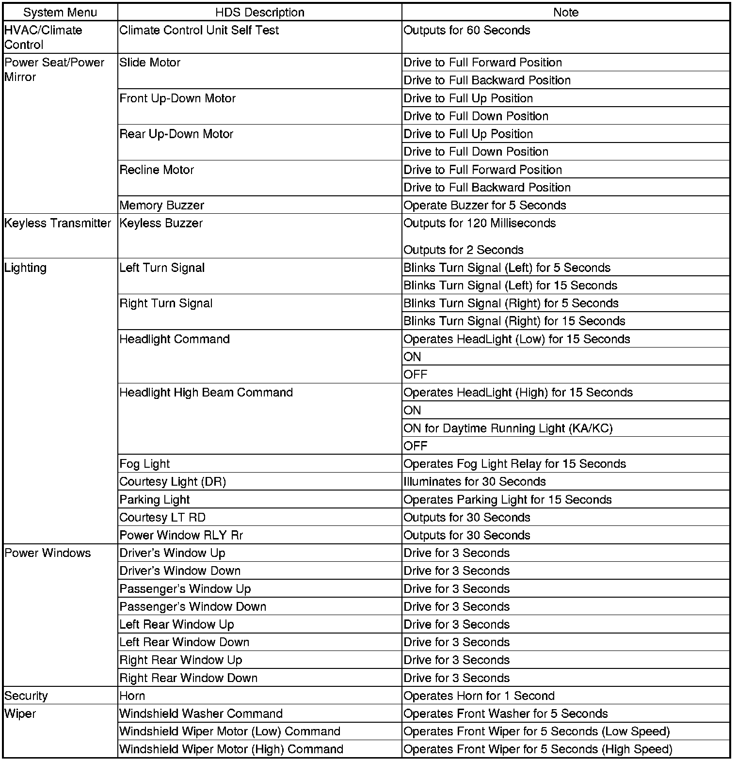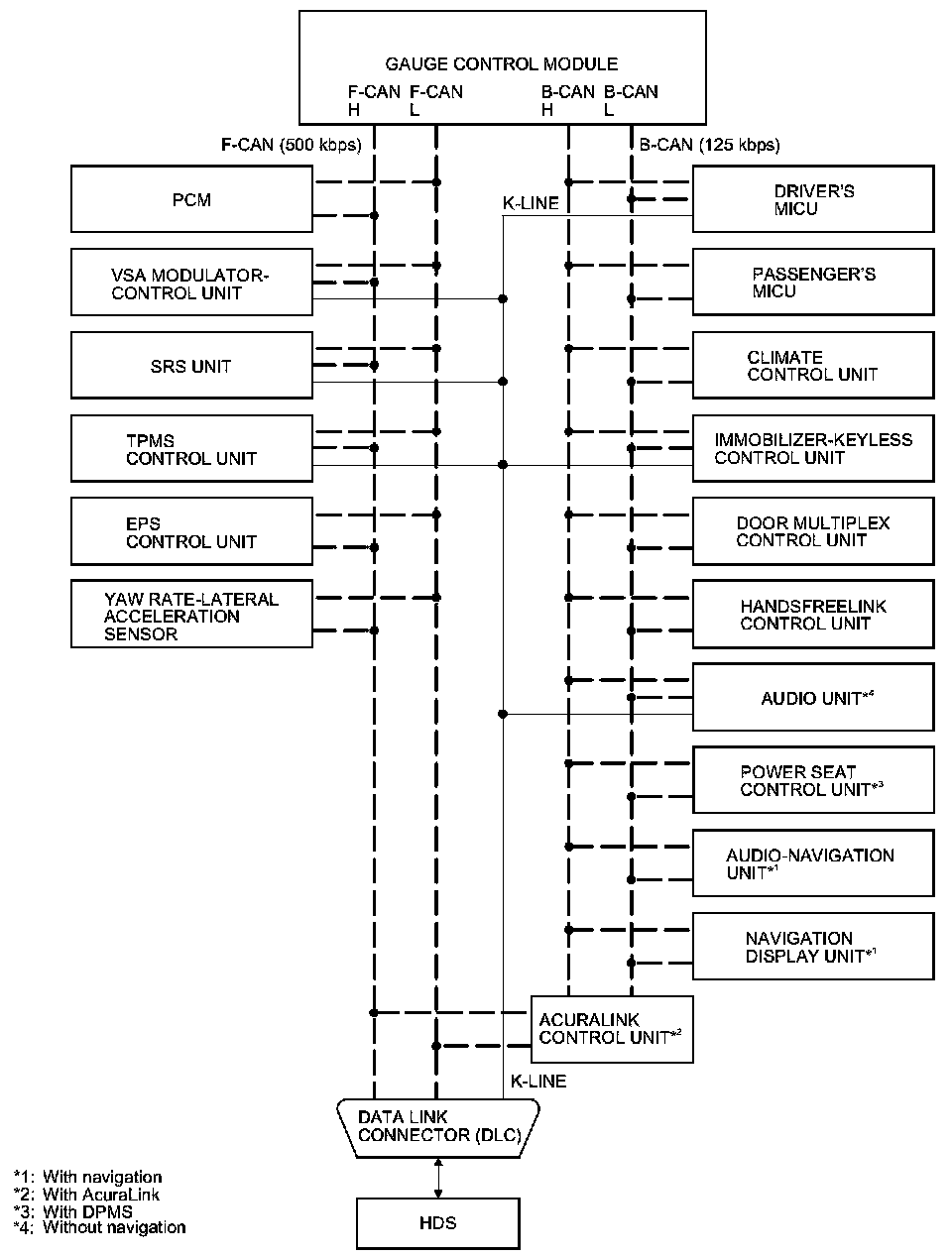 By connecting the HDS to the data link connector (DLC), the HDS can retrieve the diagnostic information from the driver's MICU via a diagnostic line called the K-LINE. The K-LINE is a separate communication line from the CAN lines, but it is connected to most of the CAN related ECUs. The driver's MICU is a gateway between the HDS and B-CAN related ECUs, and sends B-CAN diagnostic information to the HDS. When doing a function test with the HDS, the HDS sends an output signal through the K-LINE to the driver's MICU. The driver's MICU either relays the request to another ECU, or commands the function itself.