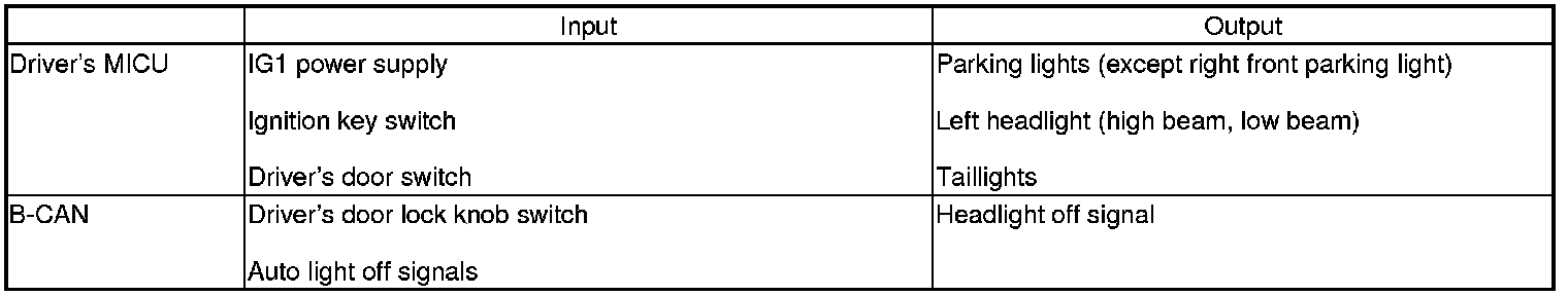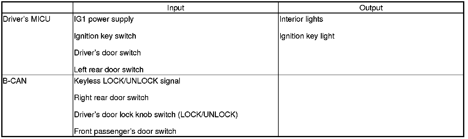 The driver's MICU control of the interior light ON/OFF is based on input signals from each switch.