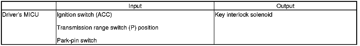 The driver's MICU control of the key interlock solenoid is based on ignition switch ACCESSORY (I) position, the transmission range switch P position, and the park-pin switch inputs.