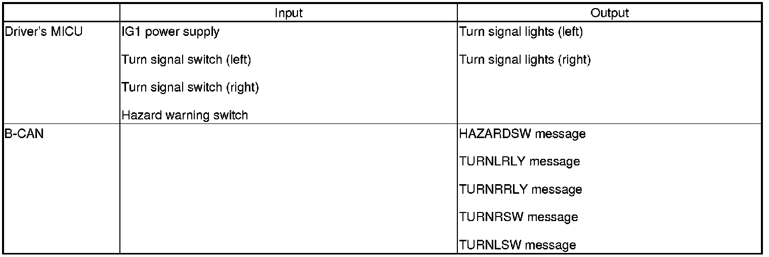 The driver's MICU control of the turn signal/hazard warning lights is based on inputs from the turn signal switch and the hazard warning switch.