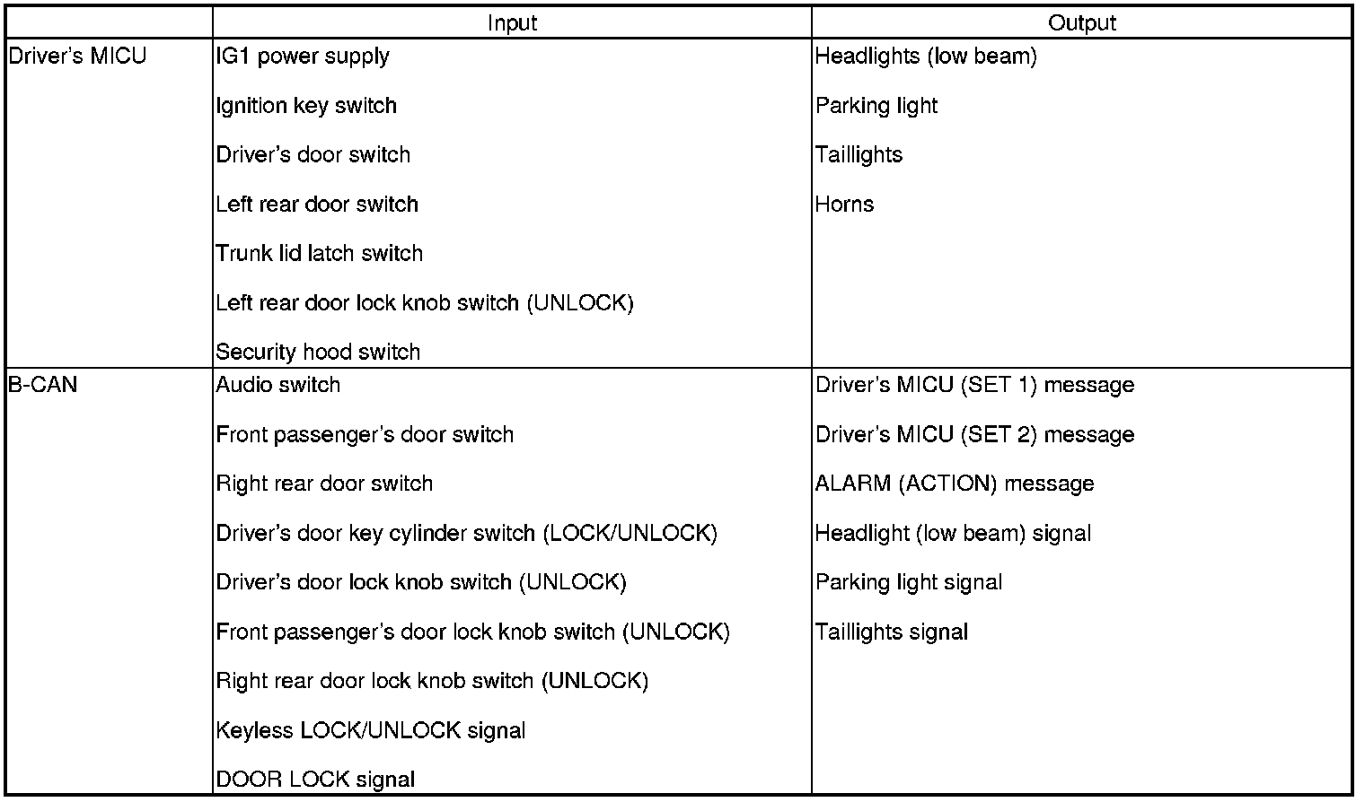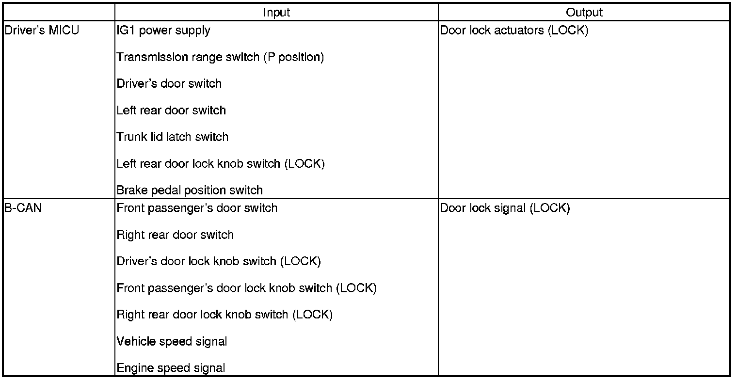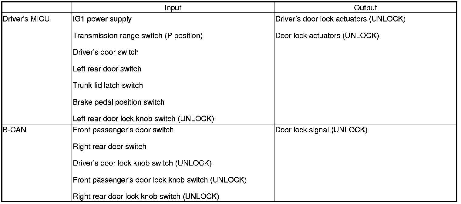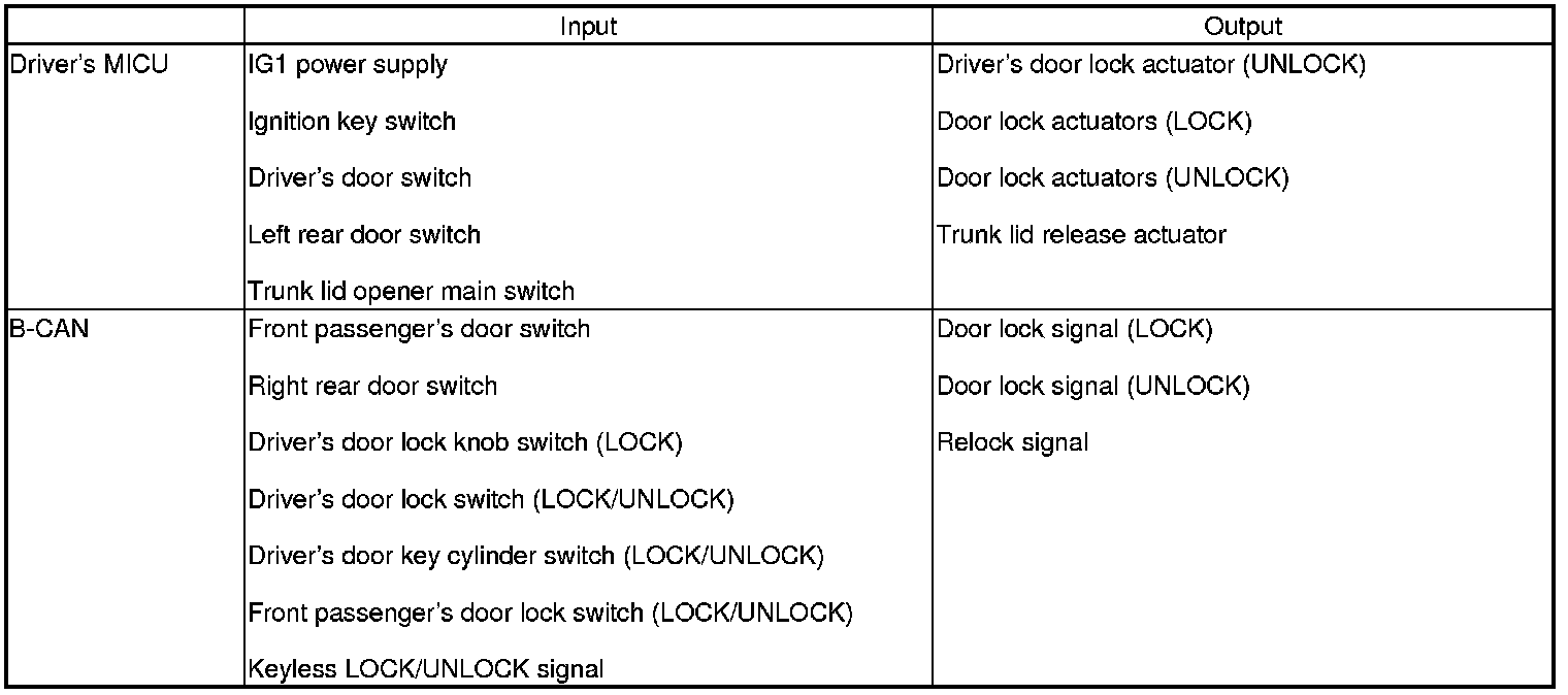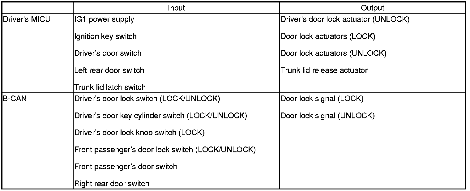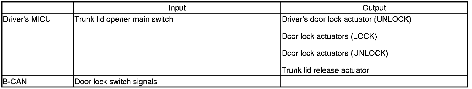 The driver's MICU control of the door lock actuators LOCK, UNLOCK, DRIVER'S UNLOCK, TRUNK UNLOCK is based on B-CAN door lock switch signals.