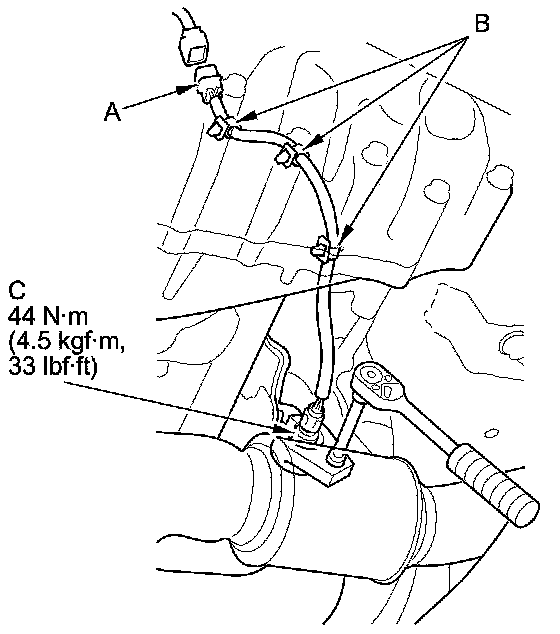 1. Disconnect the front secondary HO2S 4P connector (A), and remove the harness clamps (B).