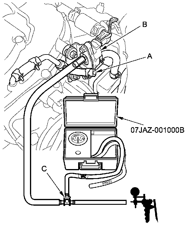8. Disconnect the vacuum hose (A) from the EVAP canister purge valve (B) in the engine compartment, then connect a T-fitting (C), a vacuum gauge, and a vacuum pump/gauge, 0-30 inHg, to the EVAP canister purge valve as shown.
