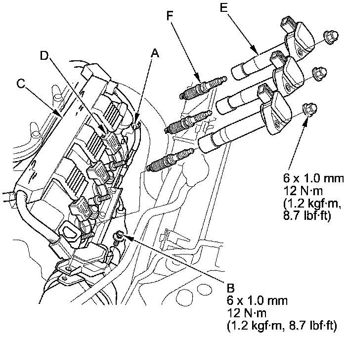 3. Disconnect the ignition coil connectors (D), then remove the front ignition coils (E).