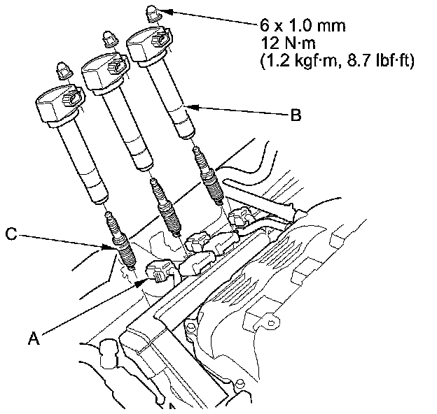 4. Remove the spark plugs (C) and inspect them Testing and Inspection.