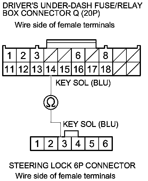 11. Check for continuity between driver's under-dash fuse/relay box connector Q (20P) terminal No. 14 and steering lock 6P connector terminal No. 3.