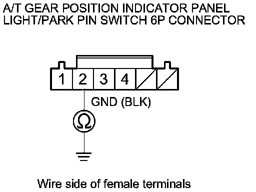 17. Check for continuity between A/T gear position indicator panel light/park pin switch 6P connector terminal No. 2 and body ground.