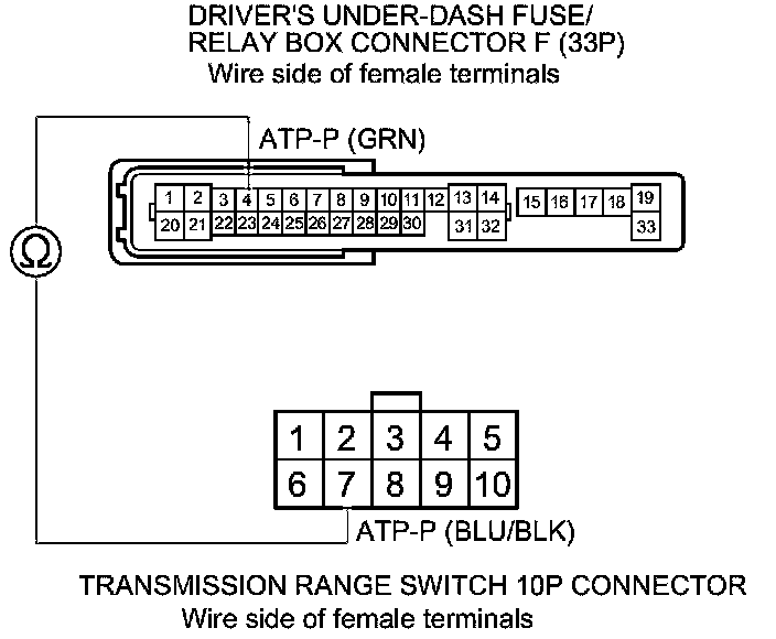 21. Check for continuity between driver's under-dash fuse/relay box connector F (33P) terminal No. 4 and transmission range switch 10P connector terminal No. 7.