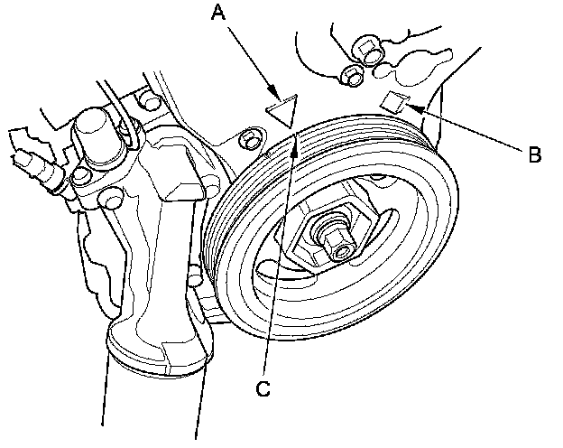 10. Aim the light toward the pointer (A) on the timing belt lower cover. Check the ignition timing under a no load condition (headlights, blower fan, rear window defogger, and air conditioner are turned off).