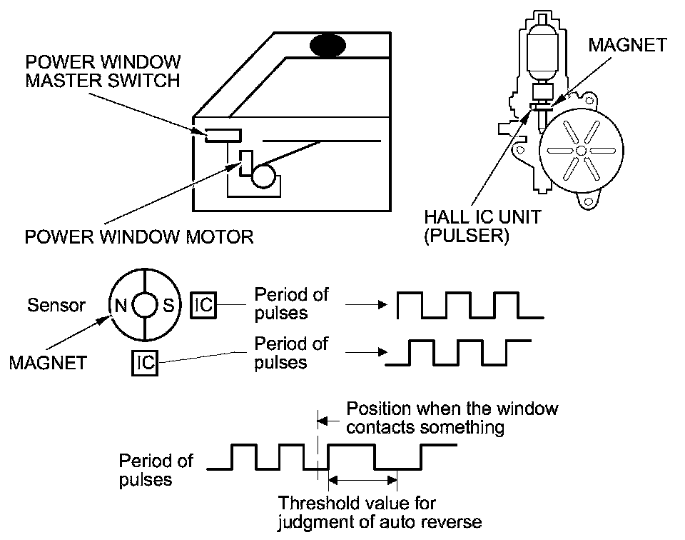 The driver's and front passenger's power window motors incorporate a Hall IC unit (pulser) which generates pulses during the motor's operation and sends pulses to the driver's and passenger's power window control units. As soon as the power window control units detect a change in the pulse frequency from the Hall IC unit (pulser), the power window control units make the power window motor stop and reverse. This prevents pinching your hand or fingers during auto-up operation. The auto reverse function does not work when the power window master switch is held in the closed position.