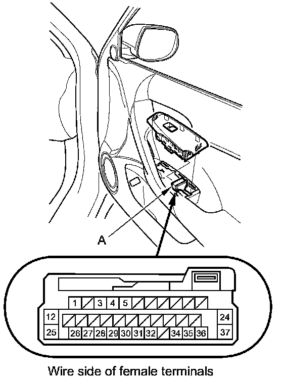 2. Test the motor in each direction by connecting battery power and ground to the front passenger's power window switch 37P connector (A) according to the table.