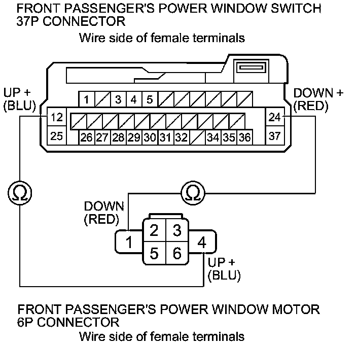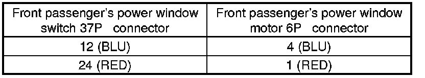 6. Check for continuity between front passenger's power window switch 37P connector terminals No. 12 and No. 24, and front passenger's power window motor 6P connector terminals No. 1 and No. 4 respectively. There should be continuity.
