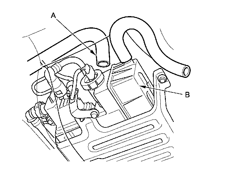 23. Disconnect the fresh air hose (A) from the EVAP canister (B), then connect a vacuum pump/gauge, 0-30 inHg, to the EVAP vent shut valve as shown.