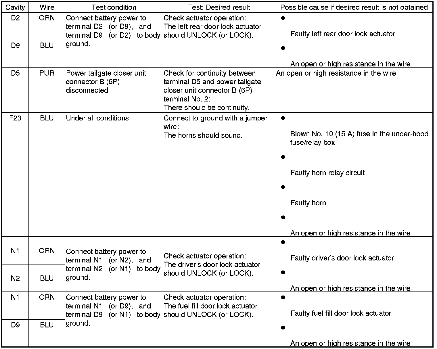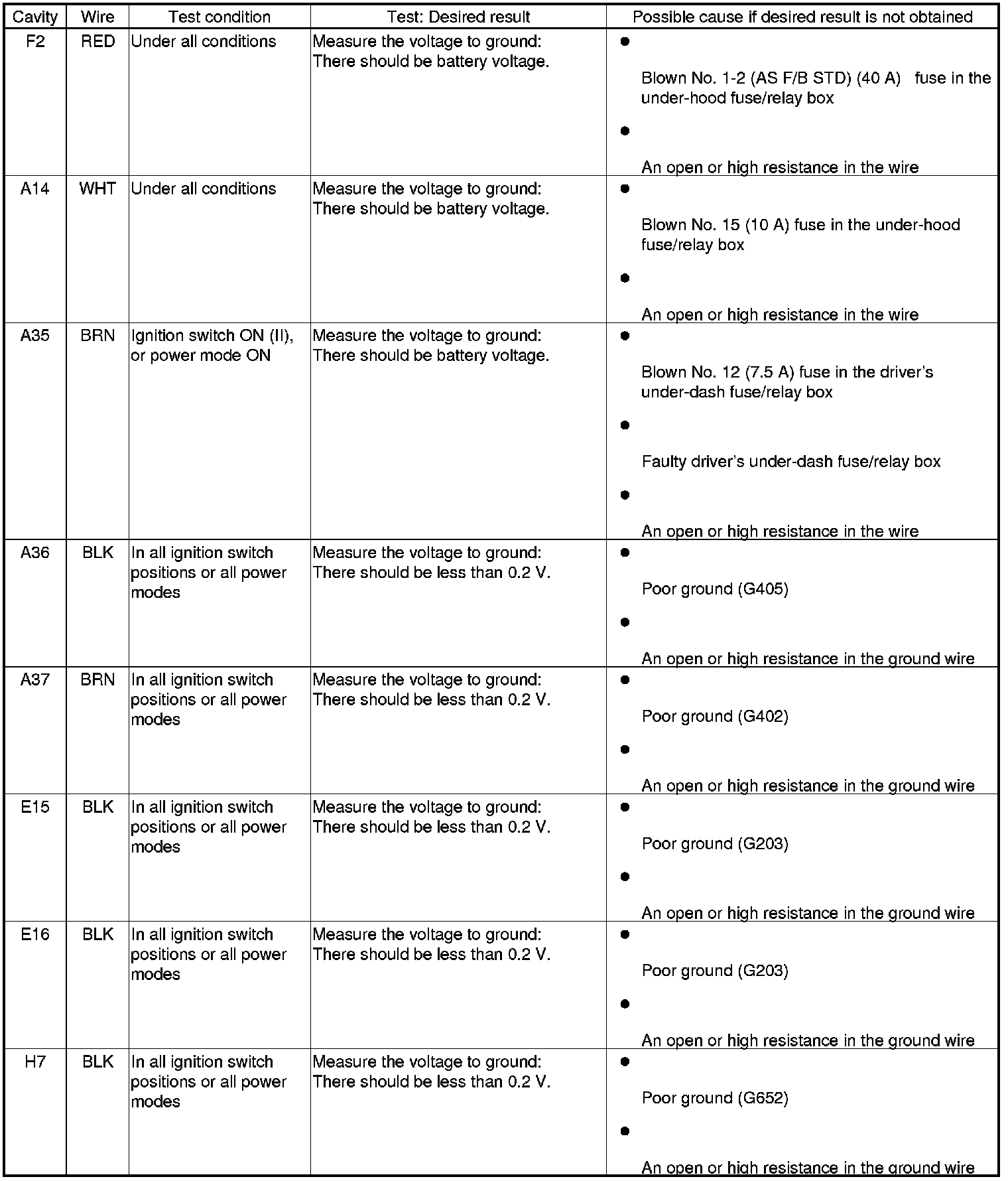 NOTE: Before testing, make sure the No. 10 (10 A) fuse in the passenger's under-dash fuse/relay box is OK.