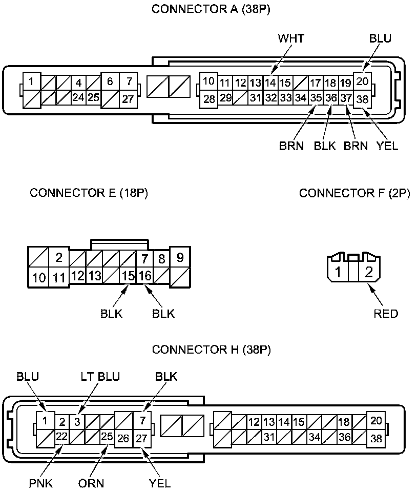 9. Disconnect passenger's under-dash fuse/relay box connectors A, E, F, and H.
