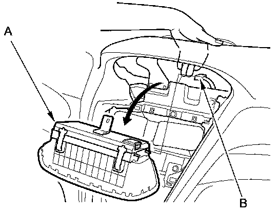 4. From the speaker hole, push out the navigation display unit (A). Then disconnect the connector (B) from the navigation display unit, and remove it.