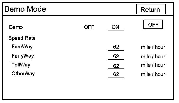 This screen is for factory use only, and should always be set to OFF. Occasionally the DEMO setting is turned ON when vehicles are being used at auto shows or similar events. Turning this feature on, allows the navigation system to automatically follow a route to a destination when the vehicle is stationary. The Speed Rate changes the speed of the demo mode.